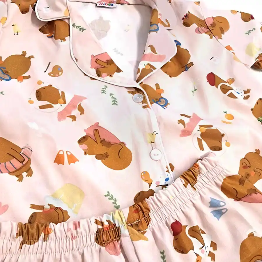Nada como um pijama infantil confortável e 100% algodão para boas noites de sono com muito charme! Sua menina vai adorar o Pijama Americano Capivaras Fofas, que nossas costureiras confeccionam com nossa estampa exclusiva!