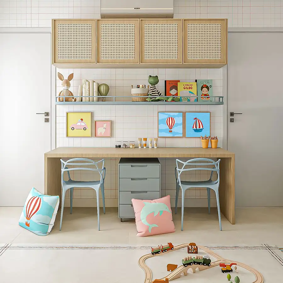 Antes de pensar em organização, pense em funcionalidade. Quartos infantis funcionam muito melhor quando têm apenas o essencial. O excesso de objetos cria bagunça visual e atrapalha a rotina da criança.